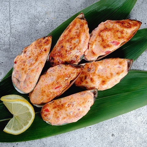 Мидии в полустворках запечённые в гриле с нашим фирменным соусом "Горгонзола" из сыра "Дор Блю", подаются с соусом "Унаги".